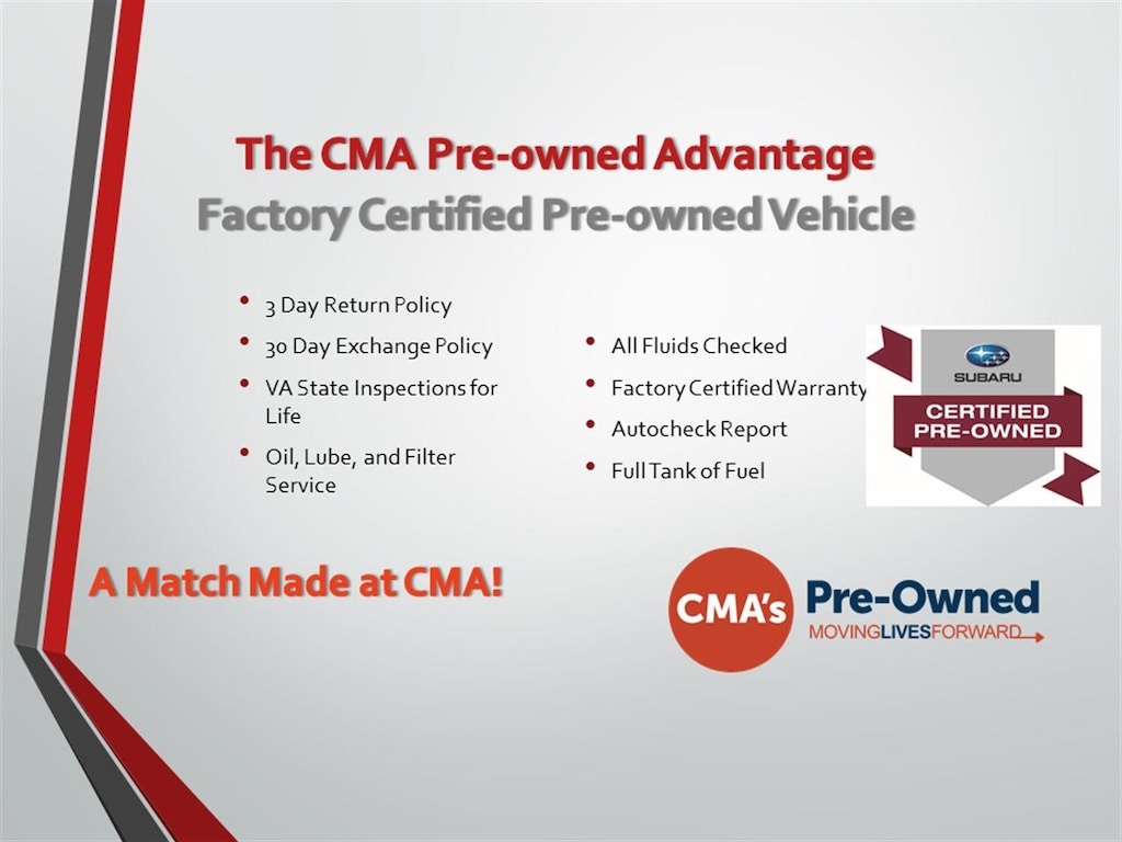 At CMA's Colonial Subaru, we're here to Serve you! Our staff is 100% dedicated to customer satisfaction and we understand that you need clear, transparent information throughout the car buying process. With our live market pricing philosophy, we offer the right cars at the right price, and the transparency to back it up!