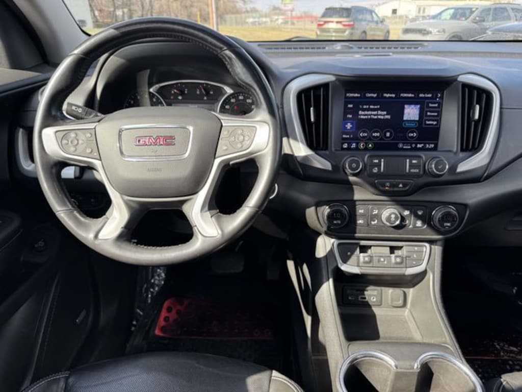 Cayenne Red Tintcoat 2022 GMC Terrain SLT AWD, 2 USB Data Ports, 2 USB Data Ports w/SD Card Reader, 3.47 Axle Ratio, 4-Wheel Disc Brakes, 6 Speakers, 6-Speaker Audio System Feature, 6-Way Power Front Passenger Seat, 8-Way Power Driver Seat Adjuster, ABS brakes, Adaptive Cruise Control, Air Conditioning, Alloy wheels, AM/FM radio: SiriusXM, Auto High-beam Headlights, Auto-dimming Rear-View mirror, Automatic temperature control, Bluetooth® For Phone, Brake assist, Bumpers: body-color, Compass, Delay-off headlights, Driver & Front Passenger Heated Seats, Driver door bin, Driver vanity mirror, Dual front impact airbags, Dual front side impact airbags, Electronic Stability Control, Emergency communication system: OnStar Guidance, Four wheel independent suspension, Front anti-roll bar, Front Bucket Seats, Front Center Armrest, Front dual zone A/C, Front fog lights, Front Passenger 2-Way Power Lumbar, Front reading lights, Fully automatic headlights, Garage door transmitter, GMC Pro Safety Plus, Heated door mirrors, Heated front seats, Heated steering wheel, Illuminated entry, Infotainment Package II, Lane Change Alert w/Side Blind Zone Alert, Lane Departure Warning System, License Plate Front Mounting Package, Low tire pressure warning, Memory seat, Not Equipped w/Driver & Fr Pass Heated Seats, Occupant sensing airbag, Outside temperature display, Overhead airbag, Overhead console, Panic alarm, Passenger door bin, Passenger vanity mirror, Perforated Leather-Appointed Seat Trim, Power door mirrors, Power Driver Lumbar Control, Power driver seat, Power Liftgate, Power passenger seat, Power steering, Power windows, Preferred Equipment Group 4SA, Premium 7-Speaker Bose Sound System w/Amplifier, Radio data system, Radio: GMC Infotainment Audio System w/8" Display, Radio: GMC Infotainment Audio System w/Navigation, Rear anti-roll bar, Rear Cross-Traffic Alert, Rear Park Assist, Rear seat center armrest, Rear window defroster, Rear window wiper, Remote keyless entry, Roof rack: rails only, Safety Alert Seat, Security system, SiriusXM Radio, Skyscape Power Sunroof w/Power Sunscreen, Speed control, Speed-sensing steering, Split folding rear seat, Spoiler, Steering wheel mounted audio controls, Tachometer, Telescoping steering wheel, Tilt steering wheel, Traction control, Trip computer, Turn signal indicator mirrors, Variably intermittent wipers, Wheels: 18" x 7" Silver Painted Aluminum, Wireless Apple CarPlay/Wireless Android Auto, AWD.